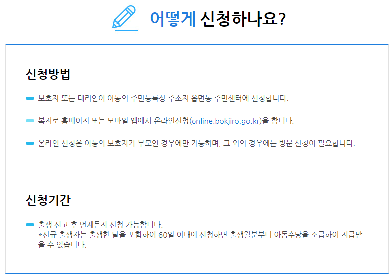 신청방법은 거주하는 주민센터에 방문하거나 복지로 홈페이지에서 온라인으로 신청하면 됩니다. 온라인으로 신청할 때는 아동의 보호자가 부모인 경우에만 가능하며, 기타 상황에서는 방문해서 접수해야 합니다. 추가로 복지로에서 아동수당 지급대상 확인도 가능하니 포털사이트에서 검색해 들어가주시기 바랍니다.