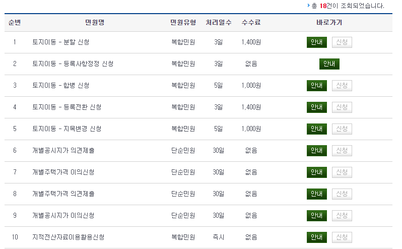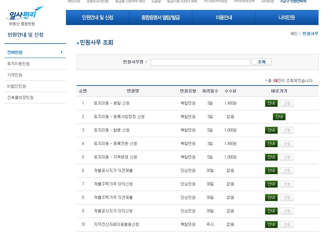 먼저 일사편리 부동산 통합민원-민원안내 및 신청-개별공시지가 이의신청을 눌러주시면 됩니다. 9. 개별공시지가 이의신청을 누르면 되는데요.