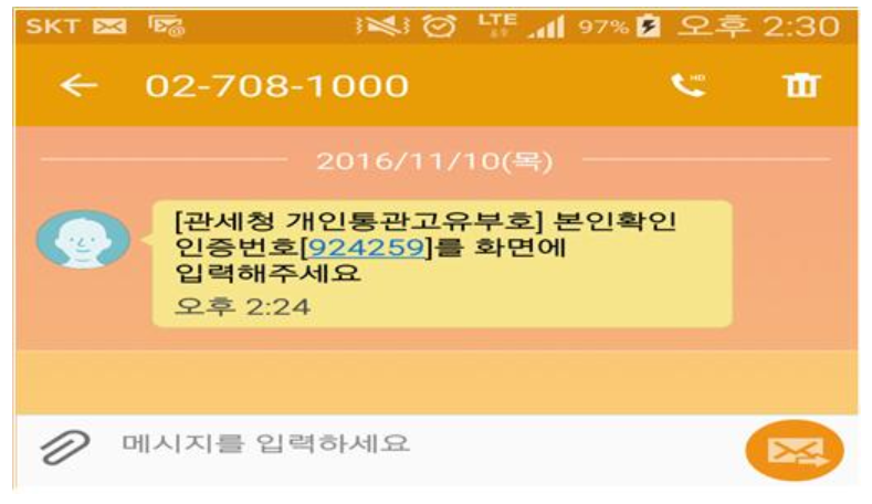이렇게 하고 나서 본인확인 후에 문자가 올 건데, 이 번호를 화면에 입력해줍니다.