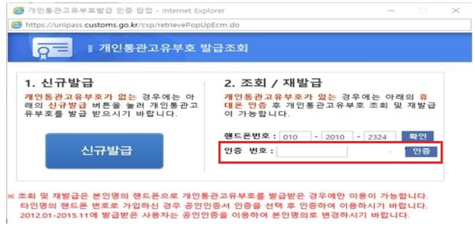 이렇게 되면 인증번호 입력 후에, 인증 버튼을 누르면 기존 개인통관고유부호 조회가 가능합니다.