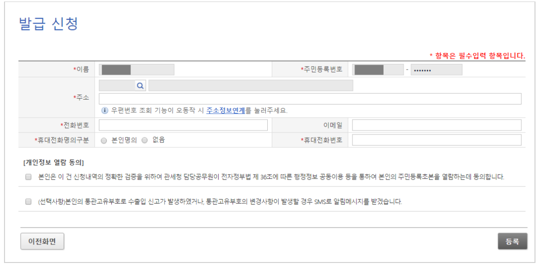 이렇게 완료가 되면 개인통관고유부호 발급 신청을 할 수 있는 신청서가 나옵니다. 여기에다 본인 주소 전화번호 명의, 이메일 등을 입력 후에 등록을 누릅니다.