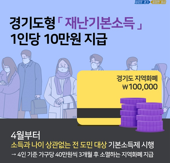 경기도는 전 국민의 약 5분에 1에 해당하는 큰 도입니다. 경기도는 다음 달 4월부터 도민 1인당 10만 원씩, 4인 가족일 경우 40만 원씩을 재난기본소득으로 지급합니다.