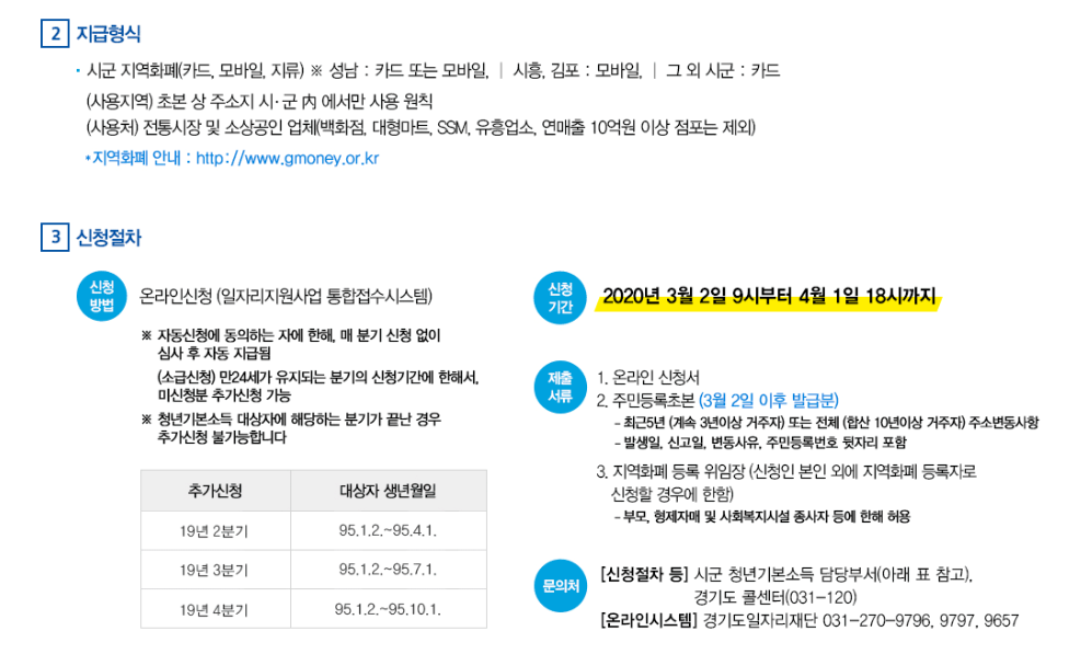 경기도 청년기본소득 신청 자격 확인이 완료되면 다음 달인 2020년 4월 20일부터 25만 원의 지역화폐를 전자카드, 모바일 등의 형태로 지급합니다. 1인당 연간 최대 100만원 지역화폐 지급으로 분기별로 25만원을 제공하는 것입니다.