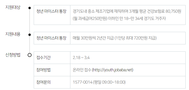 경기도 청년 마이스터통장이란 경기도에 거주하는 월 급여 250만원 이하이며, 주 36시간 이상 근무하는 만 18~34세 청년에게 2년간 월 30만 원씩의 임금을 지원하는 청년 노동자 지원사업입니다. 경기도 청년 마이스터통장 지원대상 조건은 도내 중소 제조업 노동자입니다.