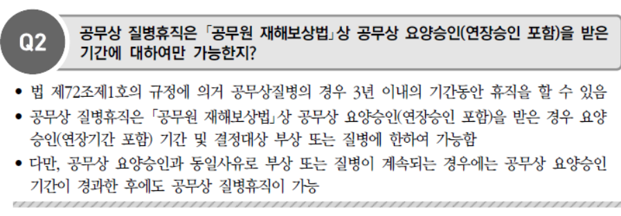 휴직기간은 1년 이내입니다. 부득이한 경우 1년 연장 가능, 공무원연금법에 따른 공무상 질병으로 인한 휴직기간은 3년입니다.