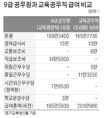 작년 기사이긴 하지만 9급 공무원과 교육공무직 급여를 비교해보면, 교육공무직이 더 높긴 합니다. (전체적으로 보았을 때)