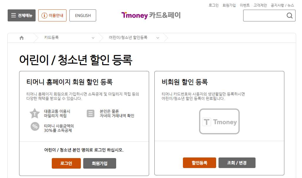 점원에게 어린이 또는 청소년 등록을 요청한 다음 10일 이내에 티머니 홈페이지(https://www.t-money.co.kr/ncs/pct/cardrgt/ReadDscdRgtDvs.dev)에 가입 후 생년월일 등록을 하면 됩니다. 교통카드 현금영수증 등록 역시 이 홈페이지에서 진행 가능합니다.