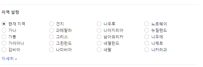 오른쪽 하단에 설정이라고 있는데 그걸 누른 후 검색설정으로 들어갑니다. 그러면 지역 설정이 가능합니다. 가~하까지 존재하니 미국 또는 일본 영국 등등으로 바꿔서 사용하시면 됩니다. 매우 간단히 설정이 되는 걸 확인할 수 있습니다.