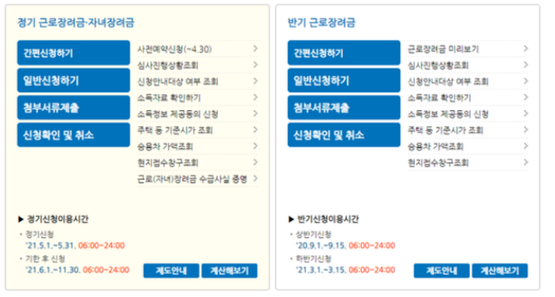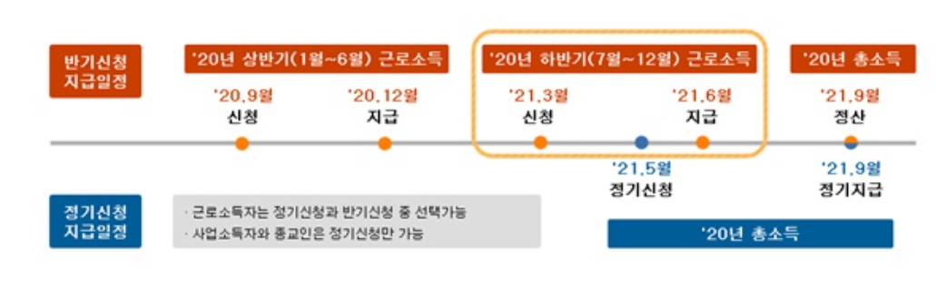2021년 근로장려금은 2020년도 하반기 소득에 대한 반기 신청은 3월에, 2020년 총소득에 대한 정기 신청이 5월에 있습니다.
