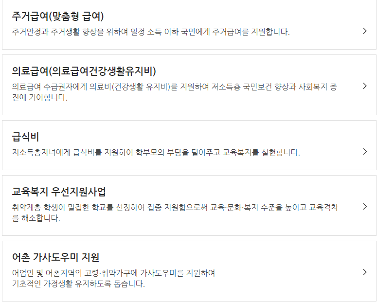 생활비 지원은 생계급여(중위소득 30% 이하)·의료급여(40% 이하)·주거급여(44% 이하)·교육급여(50% 이하) 등 네 분야로 나눠 이뤄지며, 지원액은 소득·장애 정도 등에 따라 다릅니다. 총 4가지 종류의 생활비와 생계비를 지원받는데 생계급여, 의료급여, 주거급여, 교통급여입니다.