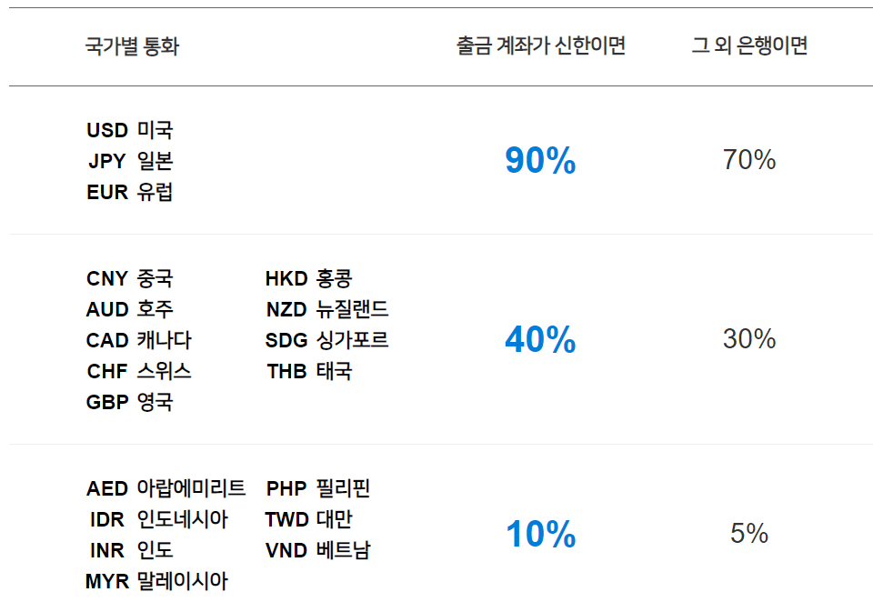 USD 달러, JPY 일본, EUR 유럽은 출금 계좌가 신한이면 90%, 그 외라면 70%까지 수수료 혜택을 볼 수가 있습니다.