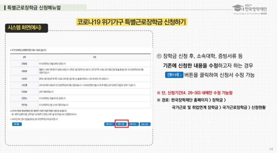 대학생 특별근로장학금 신청 방법은 매우 간단합니다. 한국장학재단 홈페이지에 들어가 코로나19 위기가구 특별근로장학금 신청을 하면 됩니다.