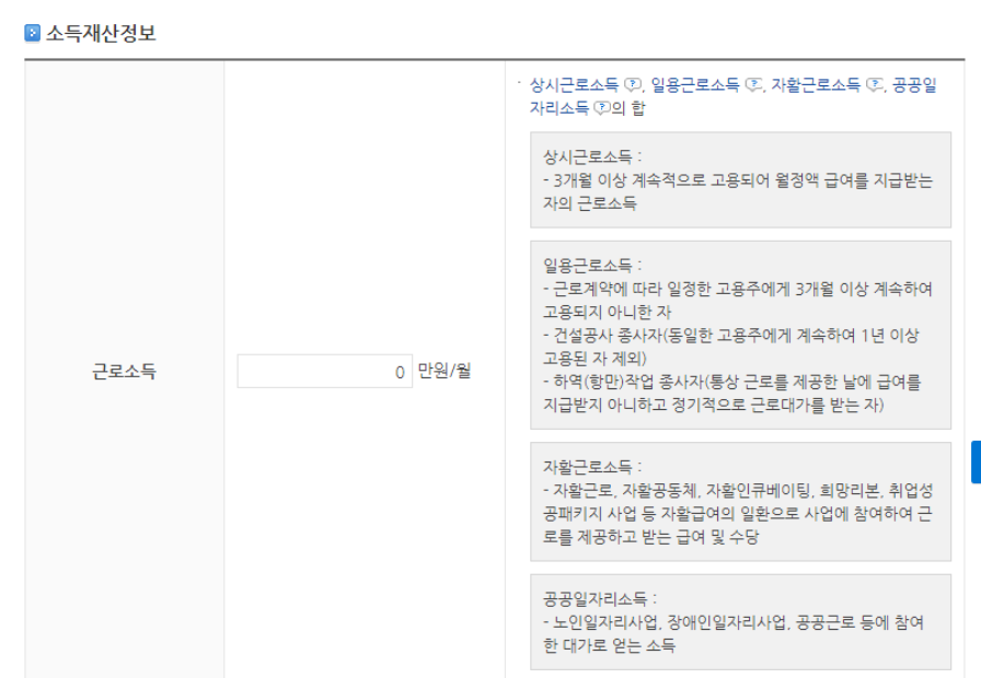 상시근로소득, 일용근로소득 자활근로소득, 공공자리소득을 월단위로 입력해줘야 합니다.