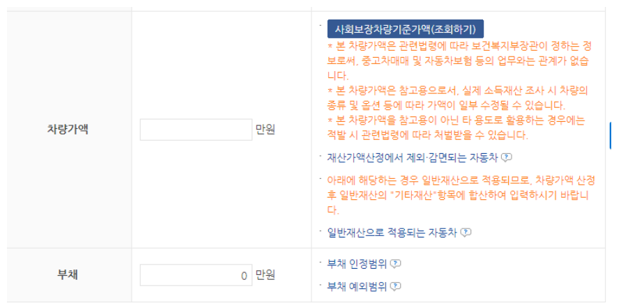 다만 가구 소득인정액 등을 확인하려면, 세부 기본정보 및 소득재산정보를 입력해주어야 합니다.