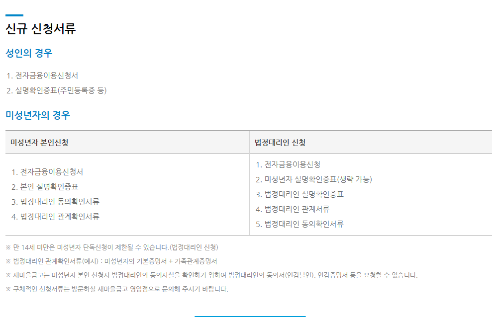 ※ 새마을금고는 미성년자 본인 신청시 법정대리인의 동의사실을 확인하기 위하여 법정대리인의 동의서(인감날인), 인감증명서 등을 요청할 수 있습니다.