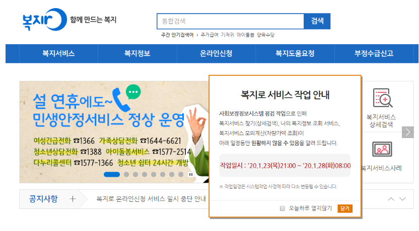 국민건강보험공단 점검 작업으로 인해 나의 복지정보 조회 서비스가 아래 일정동안 원활하지 않을 수 있음을 알려 드립니다. 작업일시 : '20.2.1(토)16:00 ~ '20.2.3(월)07:00 ※ 작업일정은 시스템작업 사정에 따라 다소 변동될 수 있습