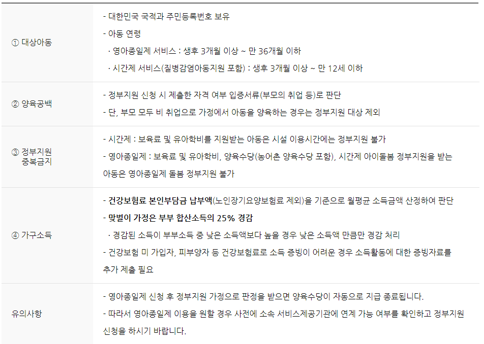 정부지원은 ① 대상아동 기준, ② 양육공백 기준 ③ 정부지원 중복금지 기준을 모두 충족해야 하며, ④ 가구소득 기준에 따라 서비스 유형별 정부지원의 범위가 달라집니다.