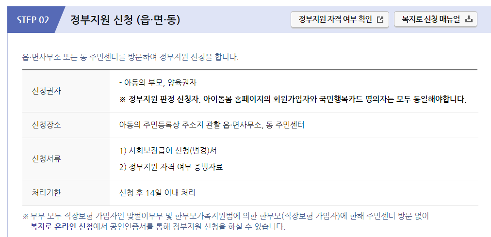 따라서 먼저 정부지원 가능 여부를 확인하고, 주소지 관할 읍면동 사무소나 주민센터에서 신청해주시면 됩니다.