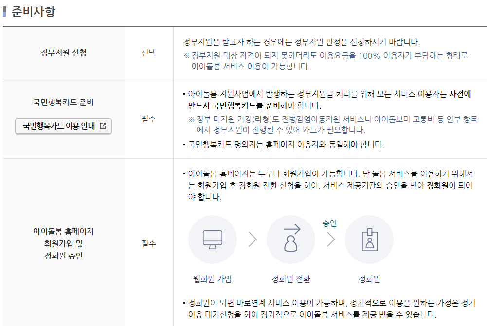 아래 그림을 참조해주시기 바랍니다. 먼저 정부지원 판정을 신청하시면 되며 (이것은 선택사항이니 해당되시는 경우만 신청합니다) 국민행복카드를 준비해야 하며, 아이돌봄 홈페이지 회원가입 및 정회원 승인을 해주셔야 합니다.