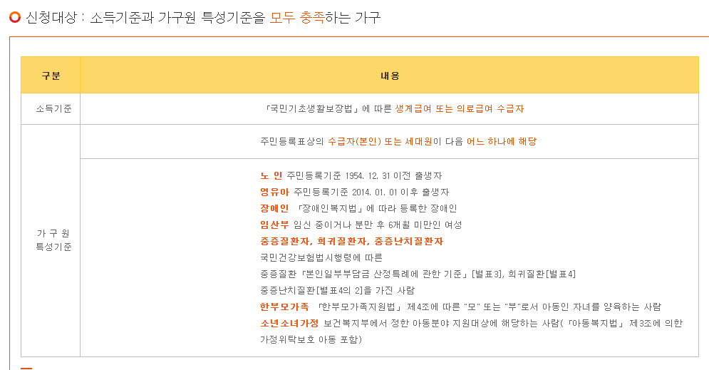 에너지바우처 신청자격은 소득기준과 가구원 특성기준을 모두 충족하는 가구만이 가능합니다. 먼저 소득기준은 「국민기초생활보장법」에 따른 생계급여 또는 의료급여 수급자여야 합니다. 생계급여 수급자 자격 및 의료급여 수급권자 기준은 각각 아래 포스팅을 봐주시기 바랍니다.