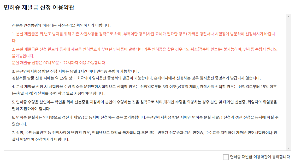 1. 분실 재발급은 위,변조 방지를 위해 기존 사진사용을 원칙으로 하며, 부득이한 경우(사진 교체가 필요한 경우) 가까운 경찰서나 시험장에 방문하여 신청하시기 바랍니다.