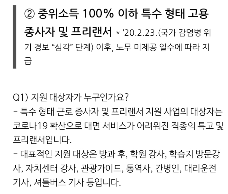 2. 중위소득 100% 이하 특수고용직 생계비 (프리랜서, 교육, 사회복지, 돌봄 업종, 기타 업종, 문화예술관광 업종)