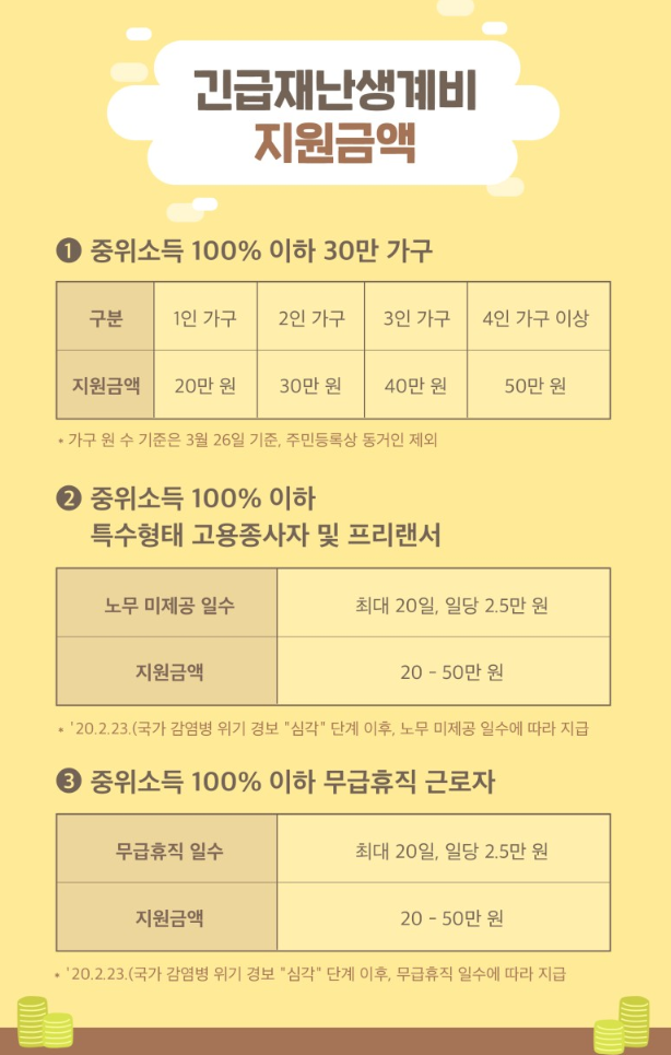 오늘은 인천 긴급재난 생계비 신청 기간, 지원 금액 등등을 알아보겠습니다. 코로나19 사태로 생계가 곤란한 취약계층 등에 가구당 20~50만원의 긴급 재난 생계비를 지원하는 것입니다.