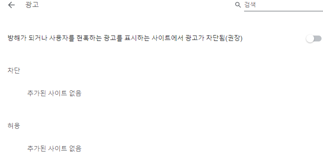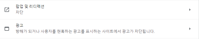 이들 중 광고로 들어가시면 다음처럼, 방해가 되거나 사용자를 현혹하는 광고를 표시하는 사이트에서 광고가 차단됨(권장)이 회색으로 되어 있는데, 이걸 활성화해서 파란 색으로 바꿔주면 차단이 됩니다.