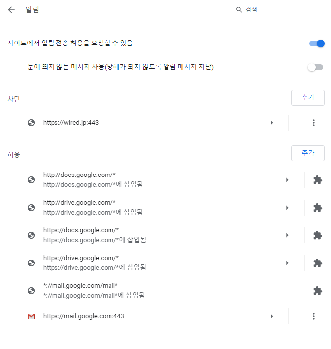 크롬 브라우저에서 설정으로 들어가시면 그 중에 개인정보보안-사이트 설정이 있습니다.