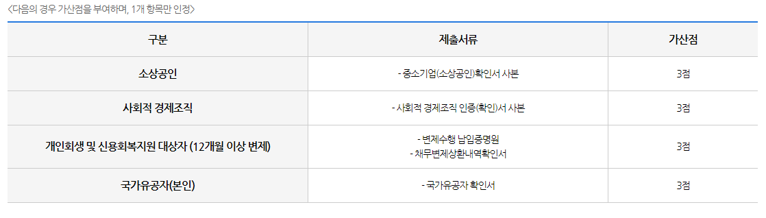 또 해당하는 경우, 가구특성 확인서류(장애인, 다문화가정, 북한이탈주민) 그리고 가산점 해당자 제출서류로 소상공인, 사회경제조직 근로자, 국가유공자 등이면 해당이 되는데 1개 항목만 인정됩니다.