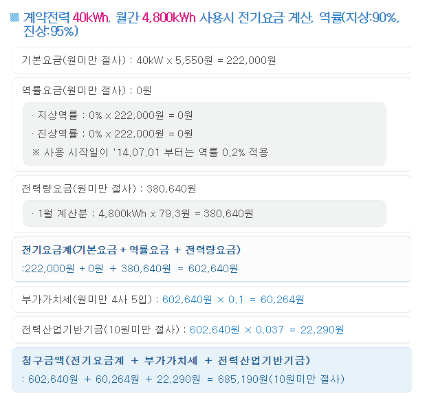계약종별로 아파트 전기요금 계산법 등 전기요금이 다른데 아래처럼 나눠보겠습니다. 일반용 전기 갑을 40KW 계약용량으로 할때 요금은 다음처럼 됩니다.