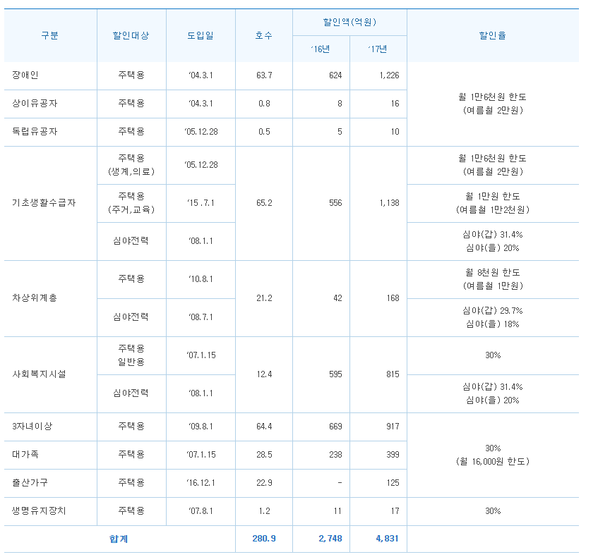 참고로 아래에 해당되면 전기요금 할인이 가능하니 꼭 확인해보시기 바랍니다. 장애인, 국가유공자, 상이유공자, 기초생활수급자, 독립유공자, 사회복지시설, 차상위계층, 2자녀이상가구, 대가족, 출산가구, 생명유지장치 등 가구에는 할인이 됩니다.