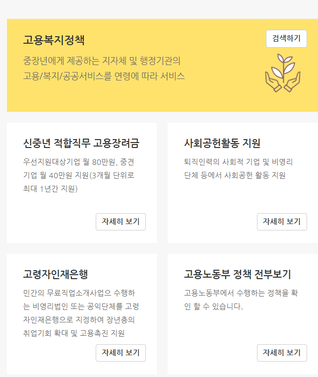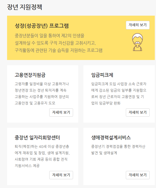 추가적으로 중장년 일자리 지원금 관련해서도 확인해볼 수가 있습니다. 중장년 분들은 아래에서 확인이 가능합니다.