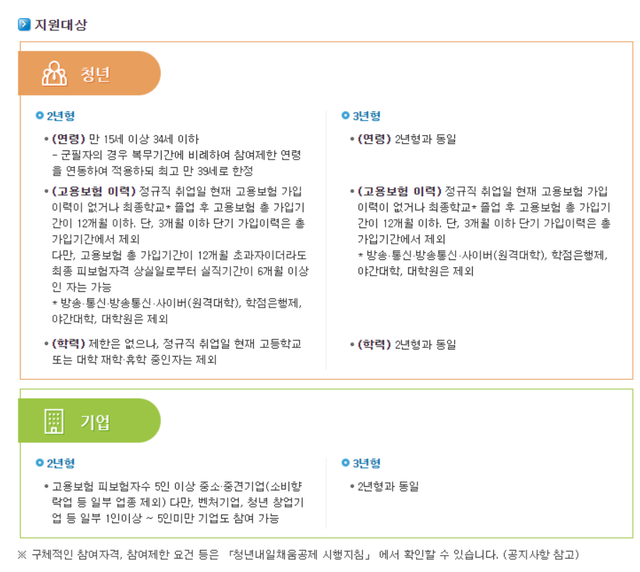 15세 이상 또는 34세 이하 젊은이의 경우 중소기업에 정규직으로 취업한 청년 대상이며, 군필자는 복무기간 대비 제한연령을 적용하되 최대 39세까지 적용하도록 돼 있습니다.