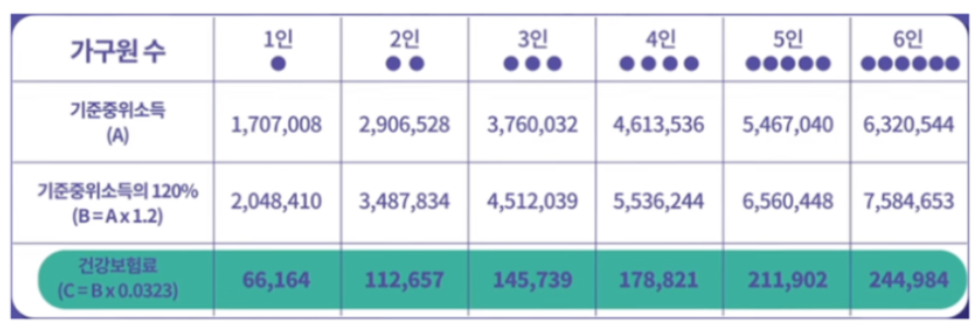 기준 중위소득은 3개월에 걸쳐 지급된 건보료에 의해 결정됩니다. 비취업기준은 적용 당일의 근무시간이 20시간 이하인 조건을 충족하면 자격이 되는 걸로 간주합니다.