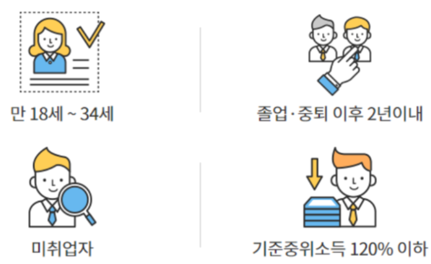 먼저 만 18~34세라는 나이 제한이 존재합니다. 추가적으로 졸업 또는 중퇴 후 2년 이내인 미취업자로 표준 중위소득의 120% 이하가 자격입니다.