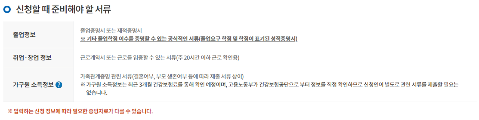 필요 서류는, 다음과 같습니다. 졸업증명서 또는 제적증명서 ※ 기타 졸업학점 이수를 증명할 수 있는 공식적인 서류(졸업요구 학점 및 학점이 표기된 성적증명서), 근로계약서 또는 근로를 입증할 수 있는 서류(주 20시간 이하 근로 확인용), 가족관계증명 관련 서류(결혼여부 및 부모 생존여부 등에 따라 제출 서류 상이)입니다.