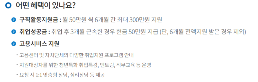 매달 50만원씩 총 6개월까지 300만원이 지급됩니다. 다만 현금으로는 못 쓰고 카드 포인트로만 제공이 됩니다. 6개월 전에 취업이 성공하여 3개월 근속하면 취업 성공금 50만원을 지급합니다.
