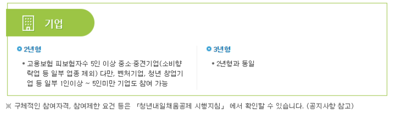 2. 기업: 청년 내일채움공제 기업자격은 5인 이상 중소, 중견 기업인데 일부 업종은 제외되며 (소비향락업) 벤처 기업, 청년 창업 기업 중 일부 기업은 5인 미만이라도 참여 가능합니다.