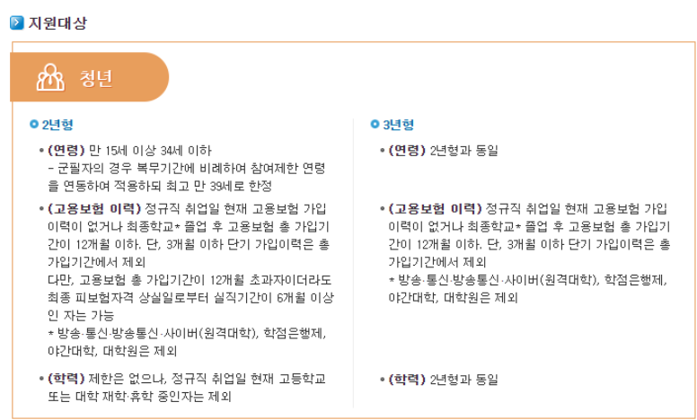 1. 청년: 먼저 청년은 2년형과 3년형으로 나뉘는데, 청년의 경우 만 15세 이상 34세 이하, 중소, 중견기업에 정규직으로 취업한 청년이며, 군필자는 복무기간에 비례해 제한 나이를 적용하되 최고 만 39세까지입니다.