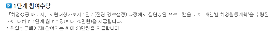 2단계: 의욕, 능력증진 - 개인별 취업활동계획에 따른 프로그램 지원 및 취업성공패키지 훈련수당 지급 (여기서 내일배움카드 발급 가능)
