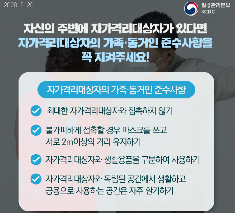 먼저 코로나 바이러스 자가격리 대상자가 있다면 아래 사항을 꼭 지켜주셔야 합니다.