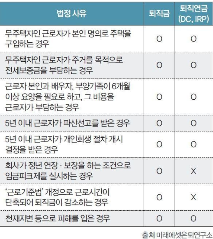 퇴직금 제도는 중간정산을 받아야 되는데 2012.7부터 중간정산이 제한되고 있기 때문입니다. 하지만 특정한 법정 사유가 있다면 중도인출도 가능합니다.