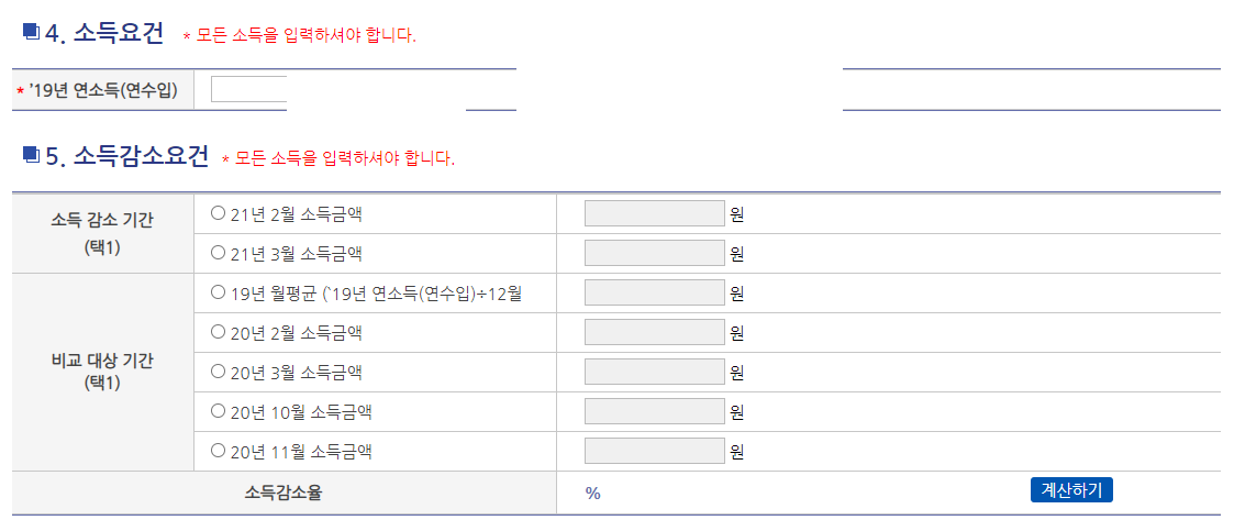 그리고 소득감소요건도 충족해야 하는데, ’21.2월 또는 ’21.3월 소득*이 비교대상 기간**의 소득 대비 25% 이상 감소한 자가 해당이 됩니다.