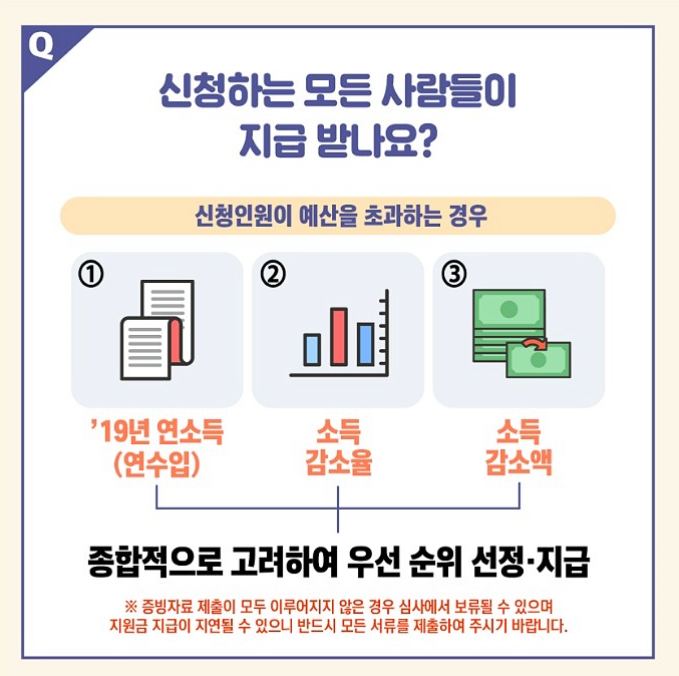 다만, 신청 인원이 예산 범위를 초과하는 경우, ’19년 연소득(연수입), 소득감소율, 소득감소액 항목별로 각각 순위를 부여하고 이를 합산한 종합순위에 따라 예산 범위 내에서 지원해서 지급 시기가 늦어질 수 있다고 하니 참조하시면 좋겠습니다.