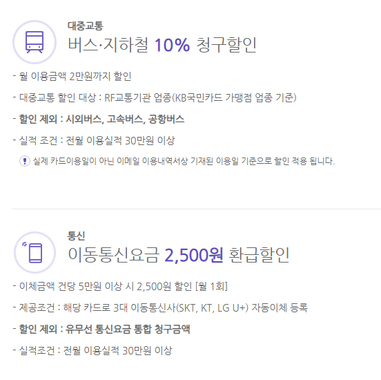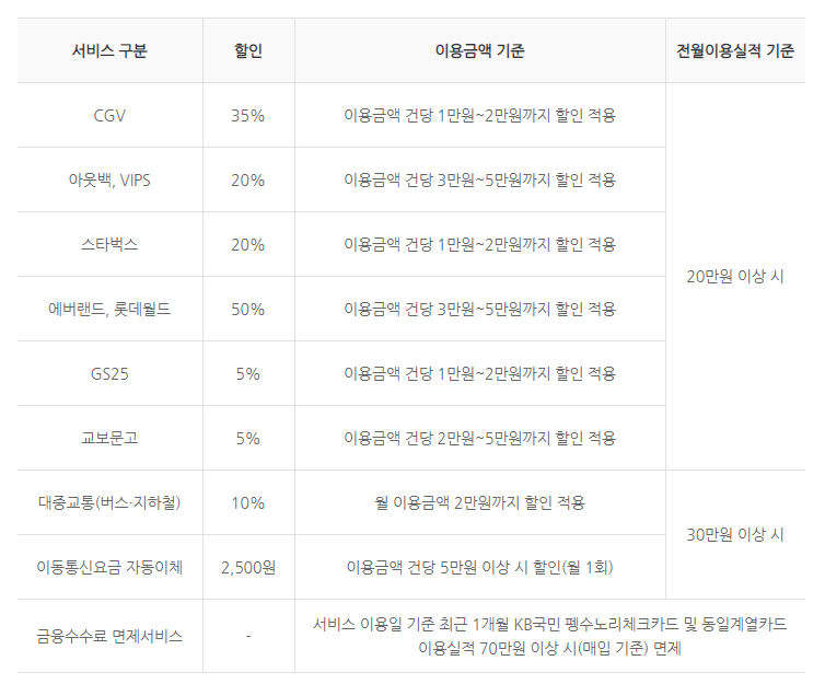 이 카드의 혜택은 다음과 같이 KB국민 노리 체크카드 혜택과 동일한데요.