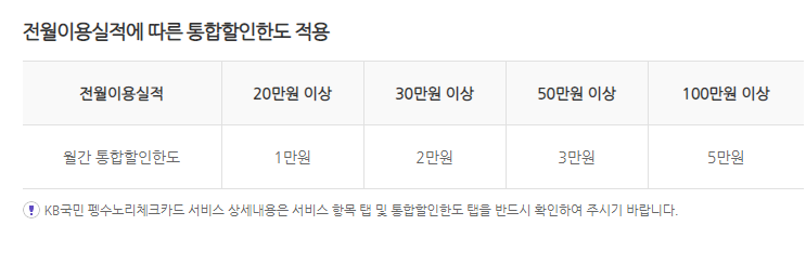 또 전월이용실적에 따른 통합할인한도도 적용이 됩니다. 이 이용실적은 전월 1일과 말일(승인시점 기준)입니다. 동일계열의 카드가 합산이 됩니다.