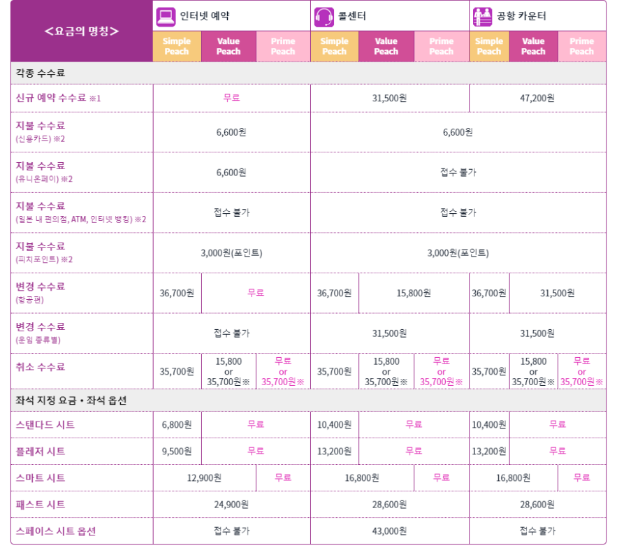 각종 수수료가 있으며 좌적 지정 요금이 있습니다. 인터넷으로 하시는 것이 좌석 지정 요금이 싼 것을 알 수 있습니다. 또 심플 피치와 밸류 피치, 프라임 피치로 나누어지는데 심플 피치일수록 저렴하나 옵션이 붙습니다.