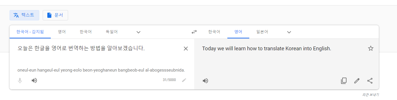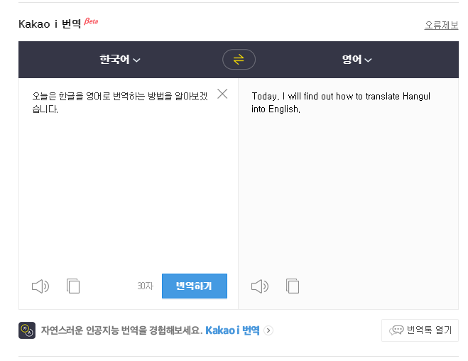 예시문장: 오늘은 한글을 영어로 번역하는 방법을 알아보겠습니다.