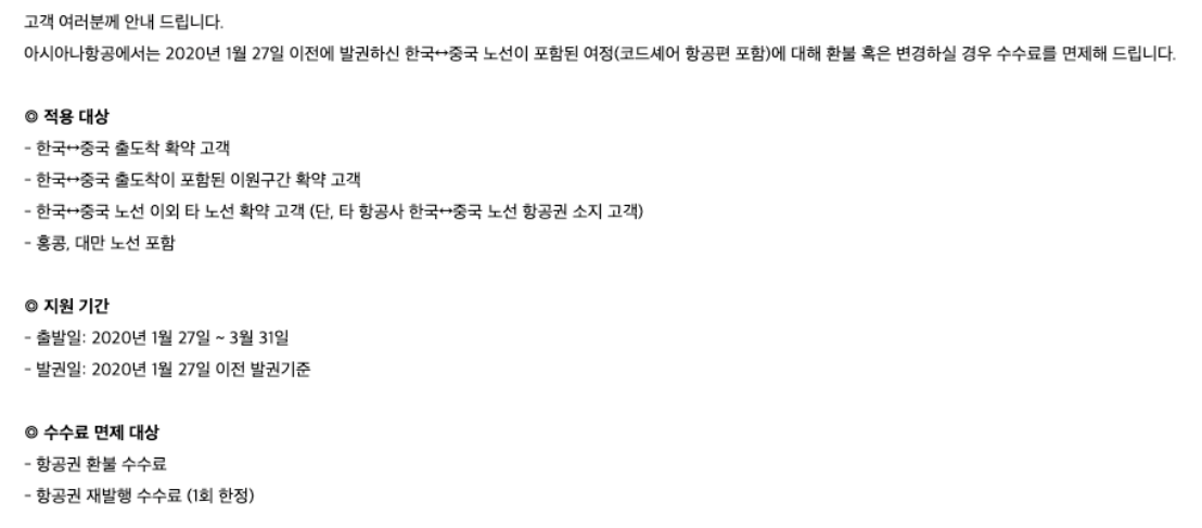 아시아나도 현재 대한항공처럼 2020년 1/24~3/31까지 한국-중국 노선 포함 여정에 환불 수수료, 재발행 수수료를 1회 한정 면제해주고 있습니다.